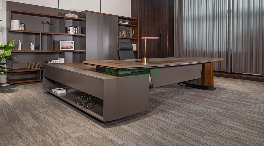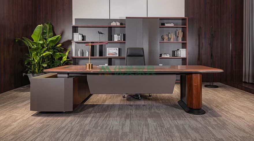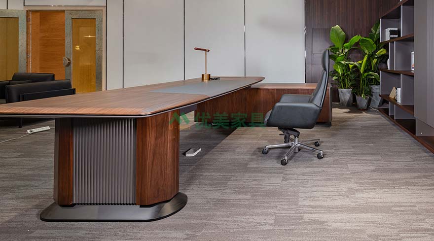 大班臺老板桌KST-B32是一款比較大氣的班臺,是實木辦公桌,如今提起實木辦公桌、大家可能都會想到之前刻板印象,以前是用整塊原木切割加工而成的實木大板桌,無雕花,無伸縮縫,整面平整,擺放起來顯老氣。而KST-B32的大班桌突破了傳統(tǒng)的大班臺的老形象,不再是單一的顏色,而是采用了深美洲胡桃+鐵灰的時尚的配色,加上副柜創(chuàng)意的切角設(shè)計,讓視覺看上去更多的線條感。橢圓形桌架加上黑色腳的設(shè)計也給整個大班臺的時尚加分不少。
